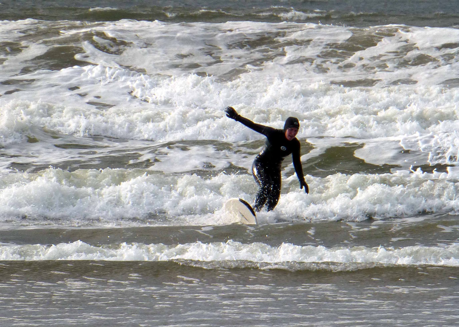 The waves, quite big ones, were rolling in the from the ocean and, near to the beach, a surfer was trying his luck in the big rolling waves. Further out, a bunch of people were trying their luck in the water, with a jet skier in the immediate vicinity. This intrepid bunch were more easily seen from the high road when we resumed the trip west.